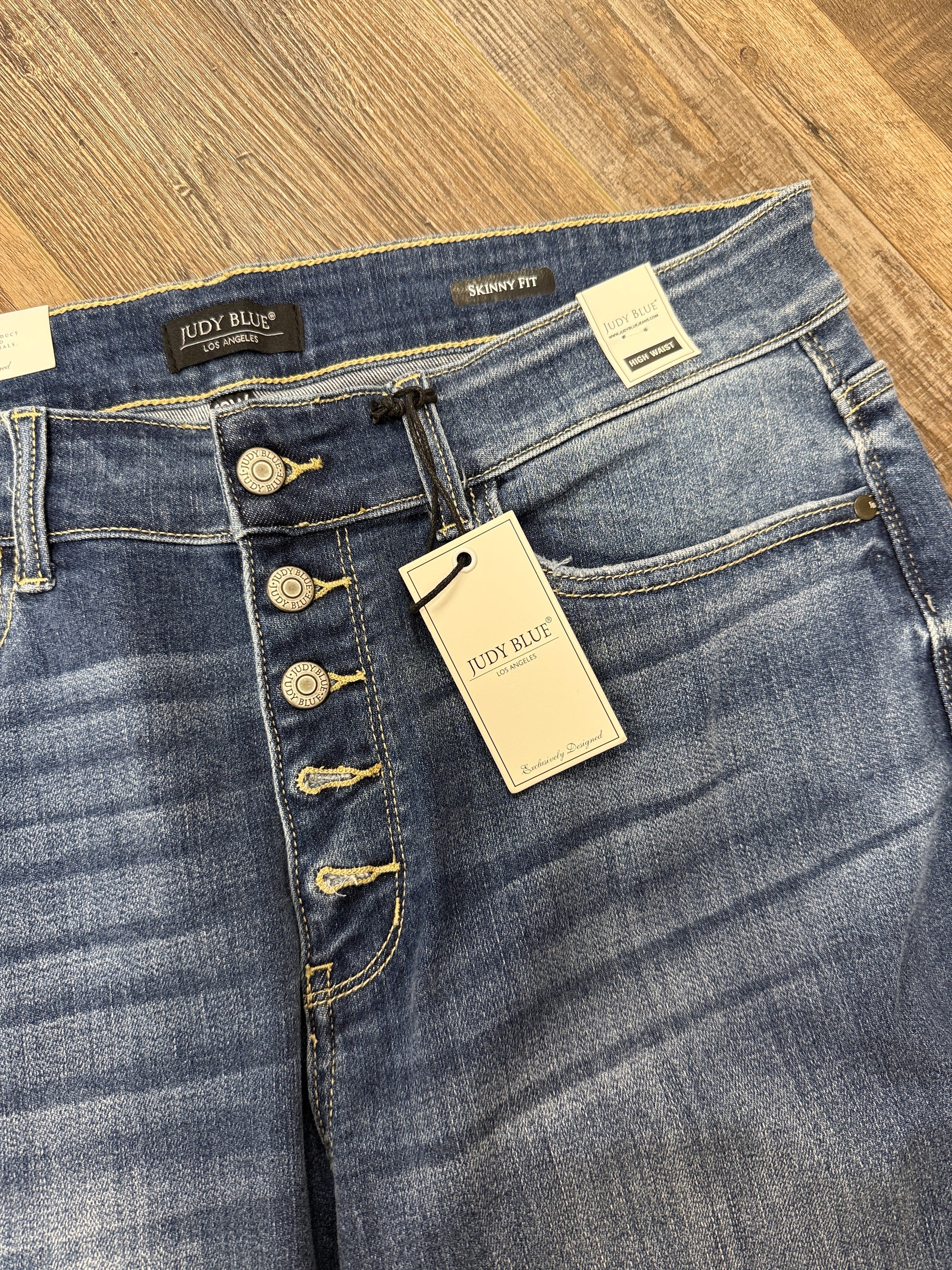 Judy Blue Jeans feature a button fly, stretchy yet skinny fit, and washed denim for ultimate comfort. Perfect for any occasion, these jeans provide both style and comfort while maintaining a flattering silhouette.