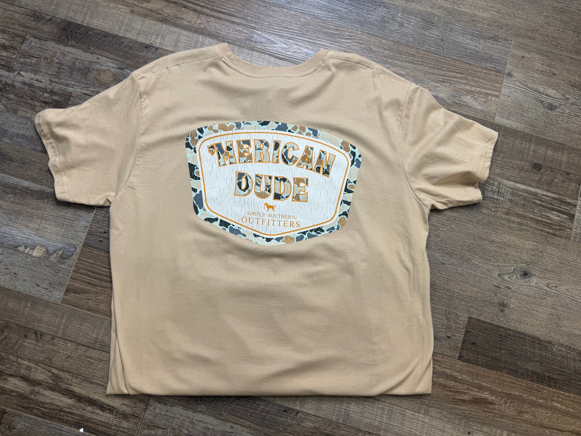 Elevate your style with the Simply Southern ‘Merican Dude Tee. Made with a bold combination of orange and camo, this tee brings a unique and eye-catching look to any outfit. Show off your American pride with this men's tee from Simply Southern.